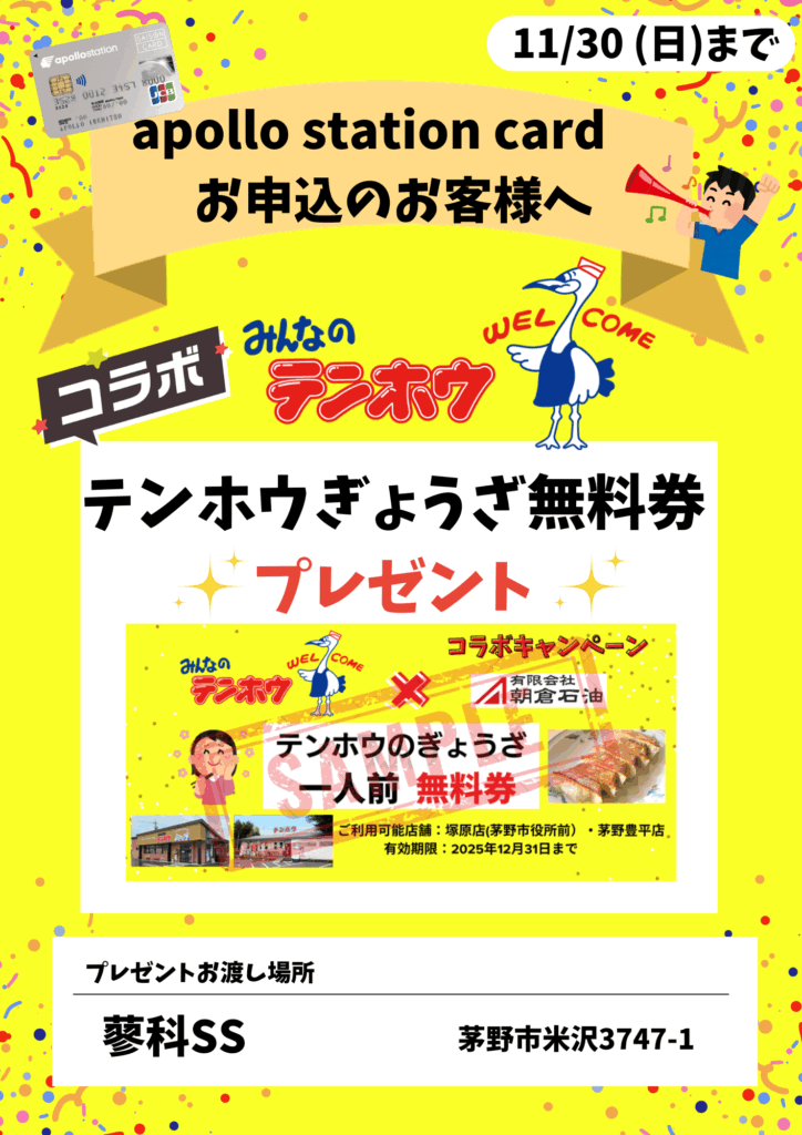 期間中に「apollostation card」に新規でお申込みいただいたお客様に、もれなく「テンホウぎょうざ無料券」をプレゼントいたします!🥟