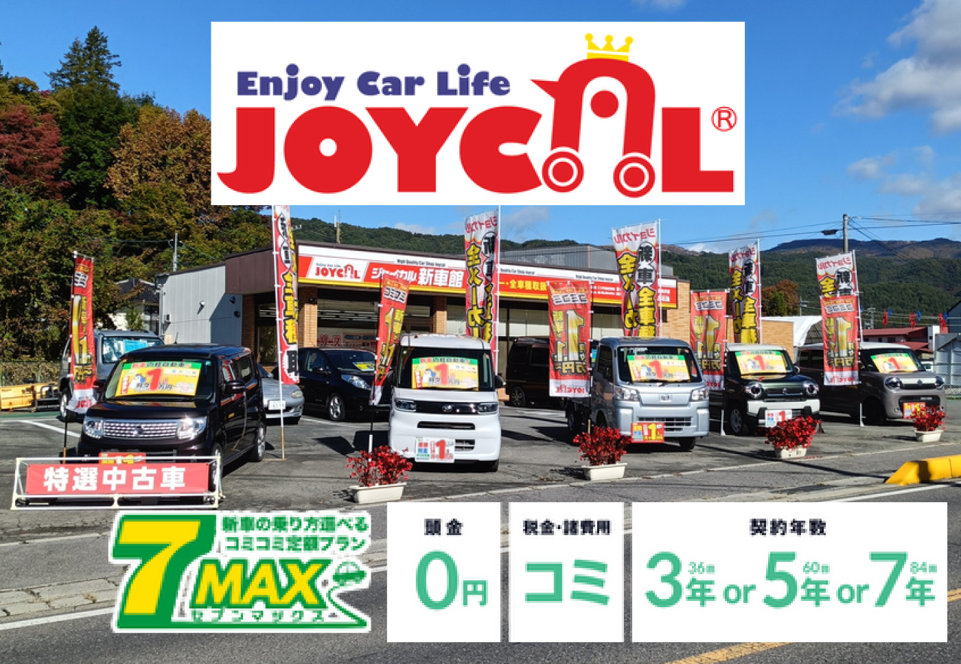 ジョイカルの人気商品「セブンマックス」は、新車が月々1万円台から乗れるマイカーリースプランです。